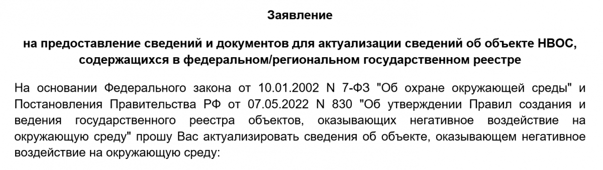 - заявление на предоставление сведений и документов для актуализации сведений об объекте НВОС, содержащихся в федеральном/региональном государственном реестре.