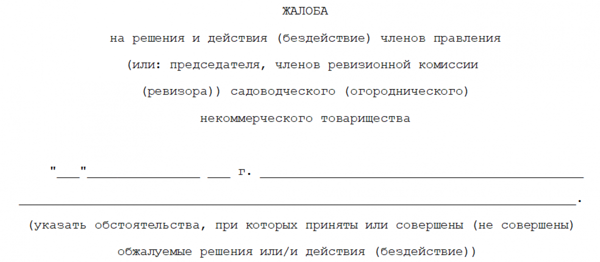 - Название документа: «жалоба на решения и действия председателя садоводческого товарищества»;