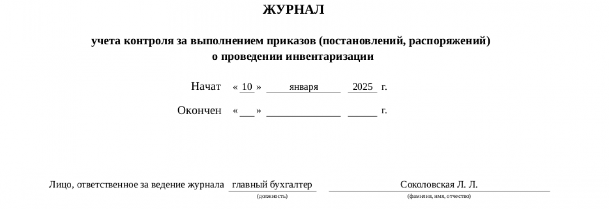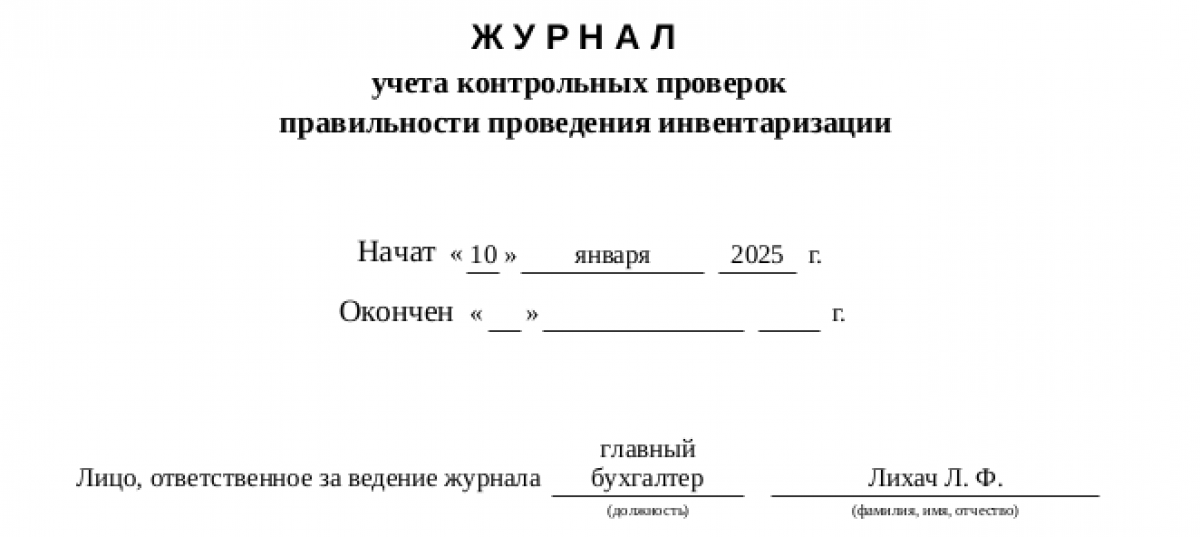 Предположим, что контрольная проверка прошедшей инвентаризации проводилась в ООО «Престиж» 03.09.2025. Проверяющий (он же лицо, ответственное за ведение журнала ИНВ-25) – главбух Лихач Л. Ф. Материально ответственное лицо – Шарк Ж. К.