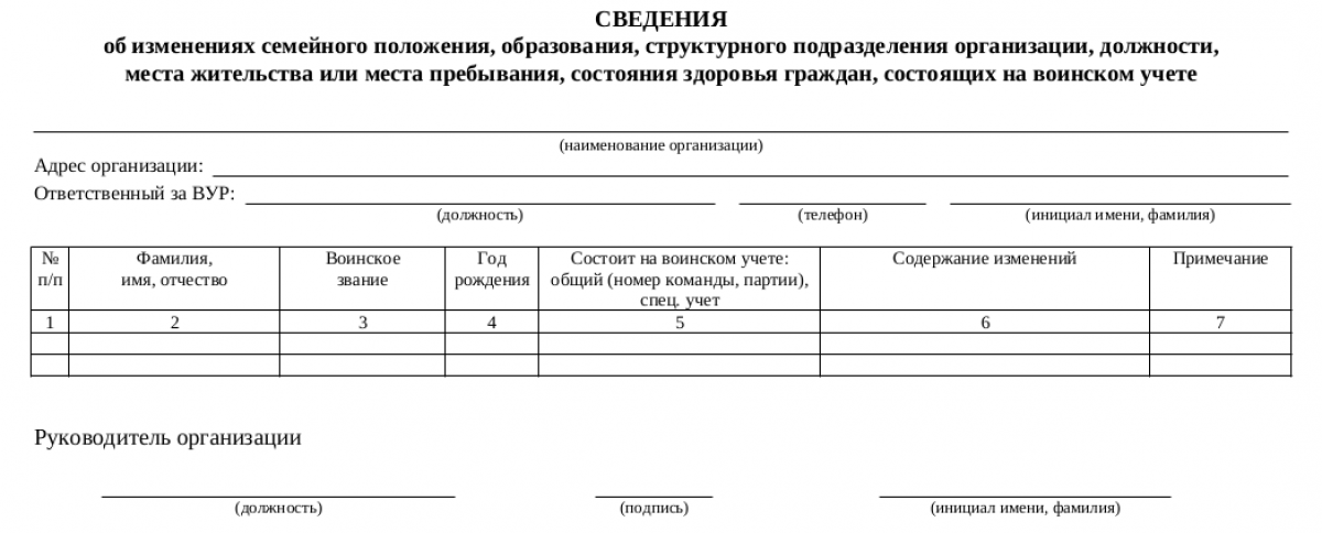 С этой целью лицо, ответственное за в/у, заполнит данную форму по работнику, не сообщившему об изменениях, и отправит ее в военкомат. Подобное оповещение проводится организацией также за 2 недели по месту жительства / пребывания гражданина.