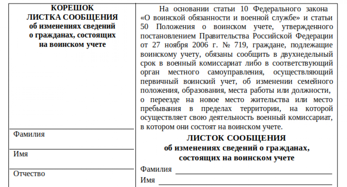 Подобные листки выдают лица, отвечающие за в/у, тем военнообязанным, у которых поменялись личные данные. Листки предназначены для информирования военкомата о произошедших изменениях. Ответственные лица также принимают от военнообязанных работников корешки с отметкой военкомата и заполняют журнал.