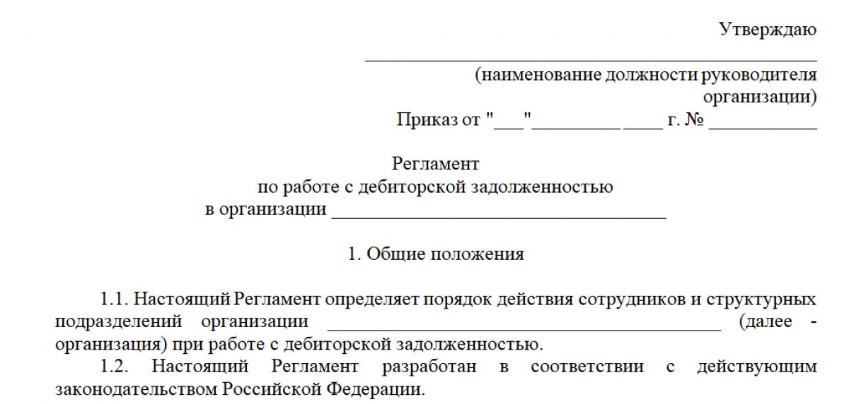 Регламент по работе с дебиторской задолженностью - важнейший документ, позволяющий эффективно контролировать дебиторскую задолженность и управлять ею. Важно, чтобы документ действовал во всех подразделениях (например: группа компаний или сеть филиалов). Регламент предусматривает порядок работы и доступные мероприятия, начиная от методик обнаружения задолженности и заканчивая ее списанием, а также ответственных за все эти мероприятия лиц.